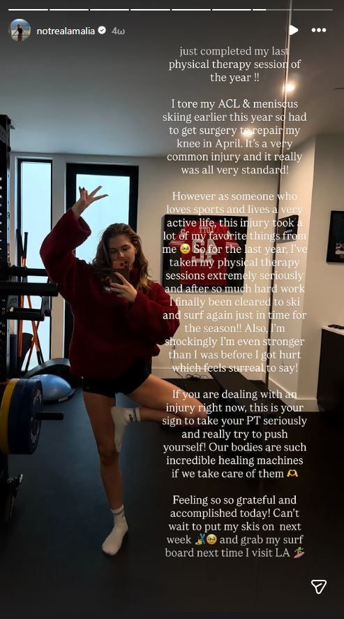 «Μόλις ολοκλήρωσα την τελευταία συνεδρία φυσικοθεραπείας για φέτος! Νωρίτερα μέσα στη χρονιά έπαθα ρήξη χιαστού και μηνίσκου κάνοντας σκι, οπότε χρειάστηκε να κάνω χειρουργείο στο γόνατό μου τον Απρίλιο. Είναι ένας πολύ συνηθισμένος τραυματισμός και, ειλικρινά, όλα ήταν αρκετά τυπικά. Ωστόσο, ως άνθρωπος που αγαπά τον αθλητισμό και ζει μια πολύ δραστήρια ζωή, αυτός ο τραυματισμός μού στέρησε πολλά από τα αγαπημένα μου πράγματα. Έτσι, τον τελευταίο χρόνο πήρα τη φυσικοθεραπεία μου πάρα πολύ σοβαρά και, μετά από τόση σκληρή δουλειά, επιτέλους πήρα το “πράσινο φως” για να κάνω ξανά σκι και surf – ακριβώς στην ώρα για τη σεζόν!! Επίσης είμαι ακόμα πιο δυνατή απ’ ό,τι ήμουν πριν τραυματιστώ, κάτι που ακούγεται σχεδόν απίστευτο!».