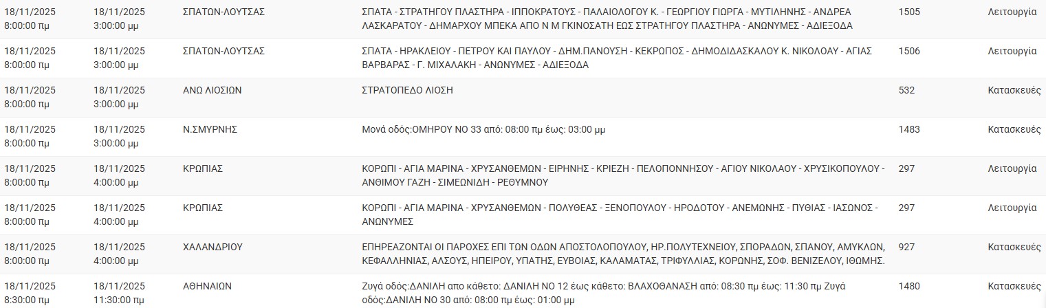 Διακοπές ρεύματος έχει προγραμματίσει για σήμερα, Τρίτη 18 Νοεμβρίου, ο ΔΕΔΔΗΕ σε διάφορες περιοχές της Αττικής.