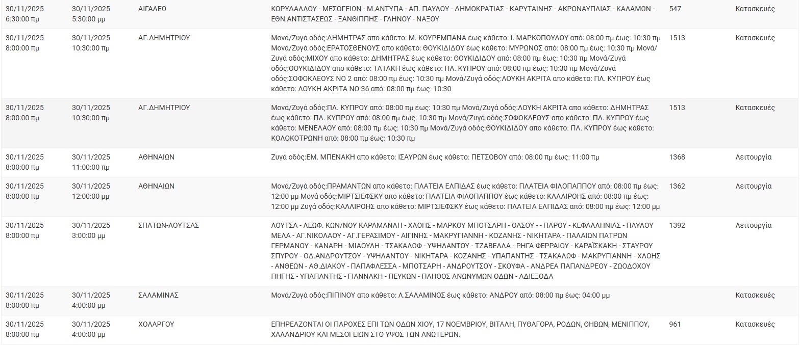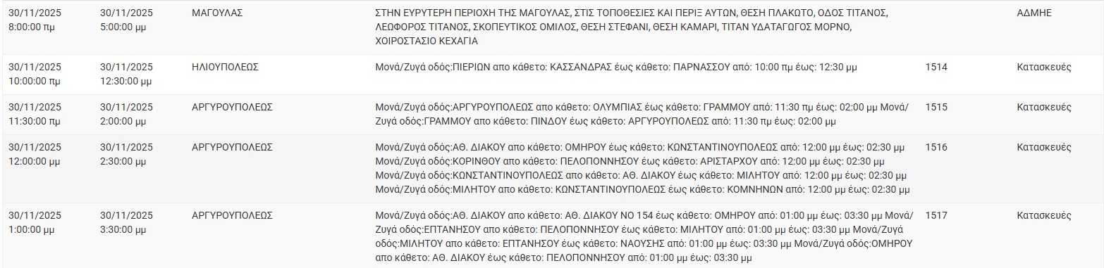 Διακοπές ρεύματος έχει προγραμματίσει για σήμερα, Κυριακή 30 Νοεμβρίου, ο ΔΕΔΔΗΕ σε διάφορες περιοχές της Αττικής.