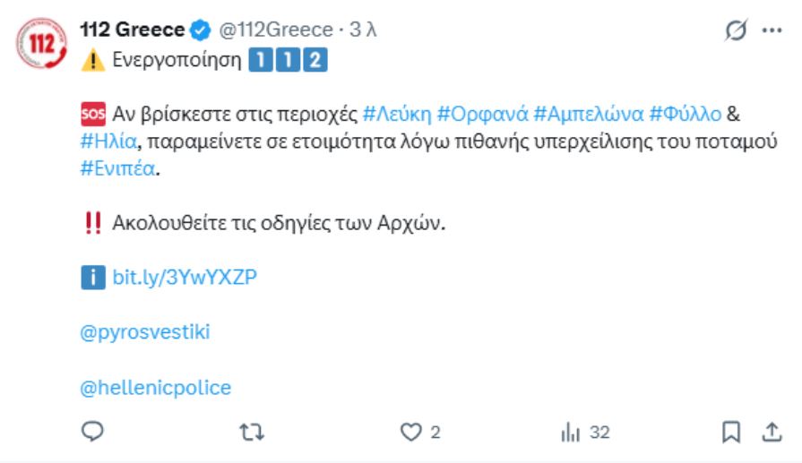 Νέο μήνυμα από το 112 εστάλη στους κατοίκους των περιοχών Λεύκη, Ορφανά, Αμπελώνα, Φύλλο και Ήλια, λόγω πιθανής υπερχείλισης του ποταμού Ενιπέα, εξαιτίας της κακοκαιρίας.