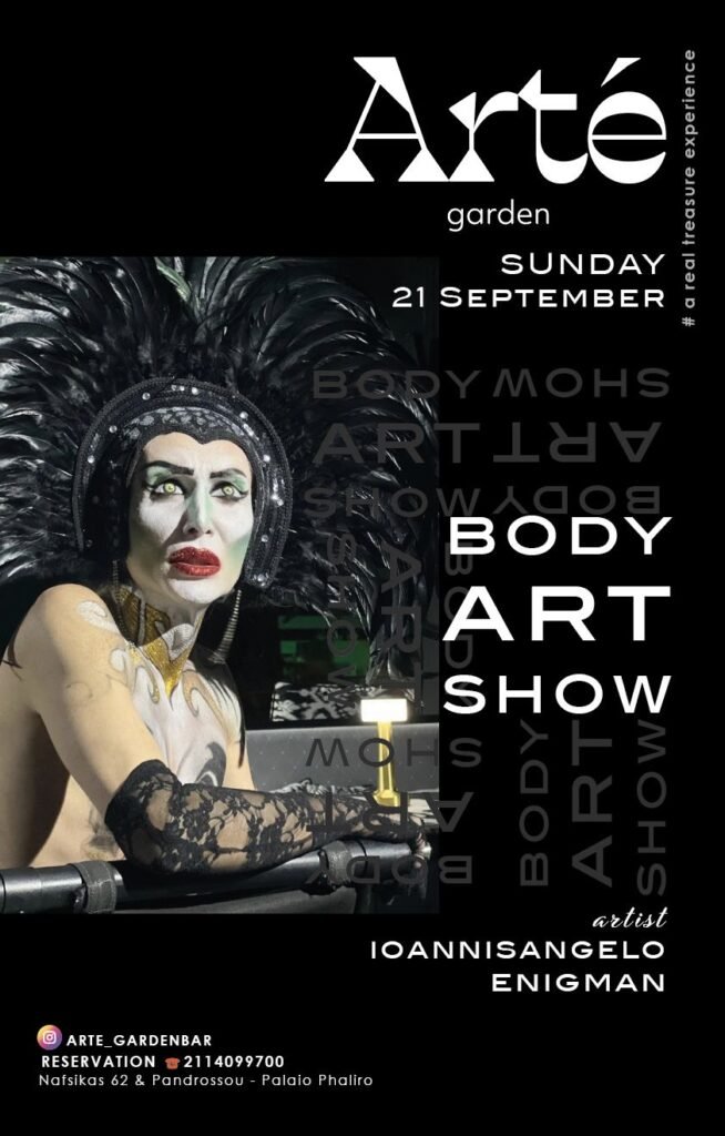 Κυριακή 21 Σεπτεμβρίου 2025 και ώρα 9:30 το βράδυ ο Άντζελο θα κάνει ένα από τα φαντασμαγορικά body art show στο ARTE GARDEN στο Φάληρο σε έναν ιδιαίτερα προσεγμένο χώρο με μοναδικές καλλιτεχνικές πινελιές. Την ενδυματολογική επιμέλεια έχει αναλάβει η Ευδοκία Βεροπούλου.
